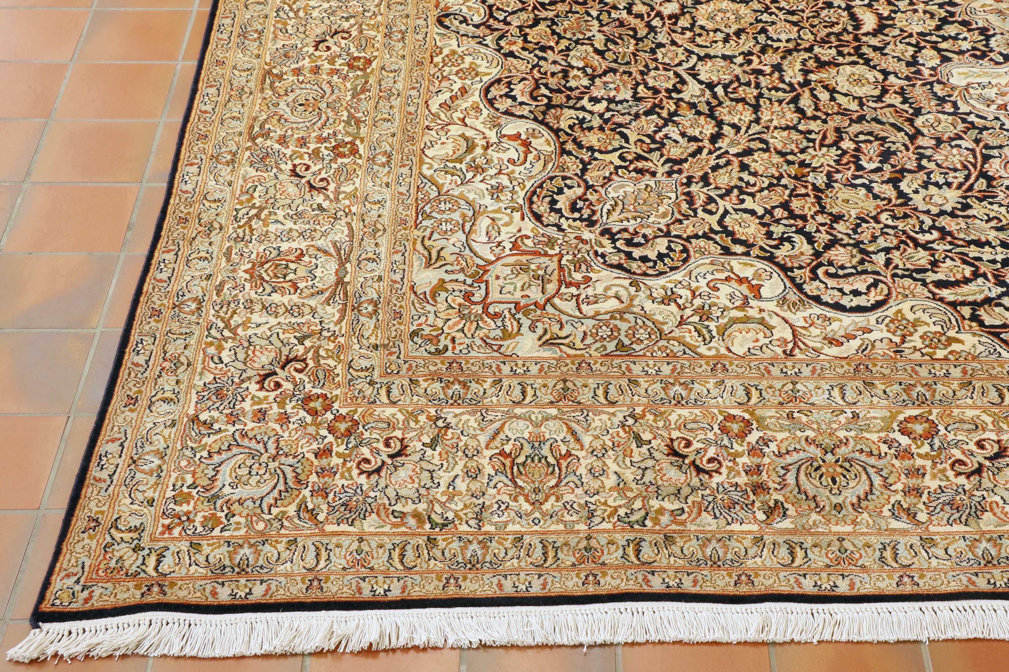 This beautiful, fine Kashmir silk carpet features a central medallion in ivory, terracotta, gold, and green on a navy blue background. The linear curve design weaves across the entire length and width of the rug. A dark blue-black background with a delicate, ornate design surrounds the main pattern. The carpet has several borders, either on the soft green ground or the same colour as the middle. This is an exquisite piece.