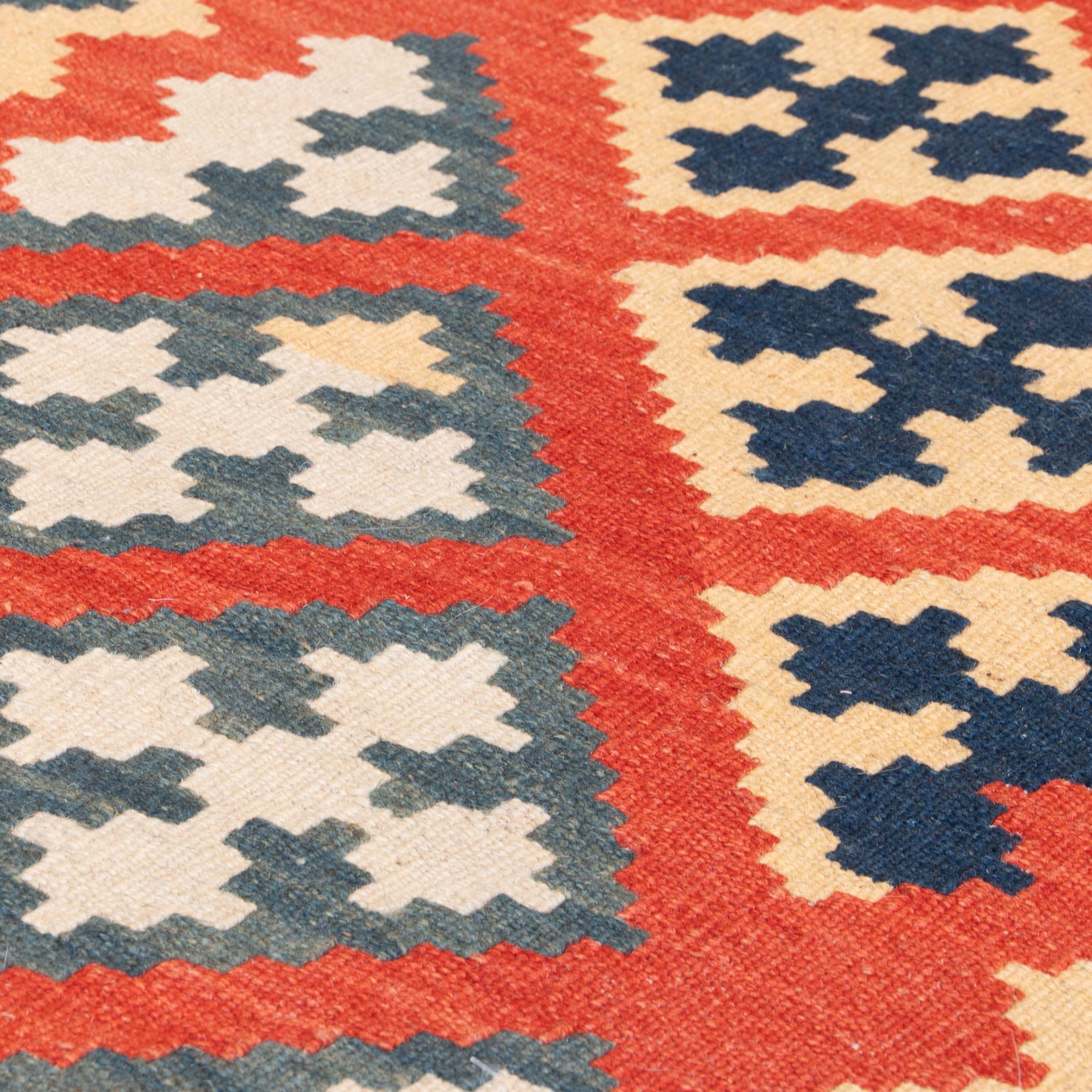 Discover authentic Qashqai craftsmanship in this stunning handwoven kelim. Rich blues, greens, and terracotta tones blend seamlessly across traditional geometric patterns that tell a story of cultural heritage. Crafted entirely from 100% wool, this reversible textile adapts to your décor—flip it to refresh your space instantly. Durable enough for everyday use yet refined enough to become a focal point, it's the perfect choice for those who value genuine artisanal quality and timeless design over mass-produced alternatives.