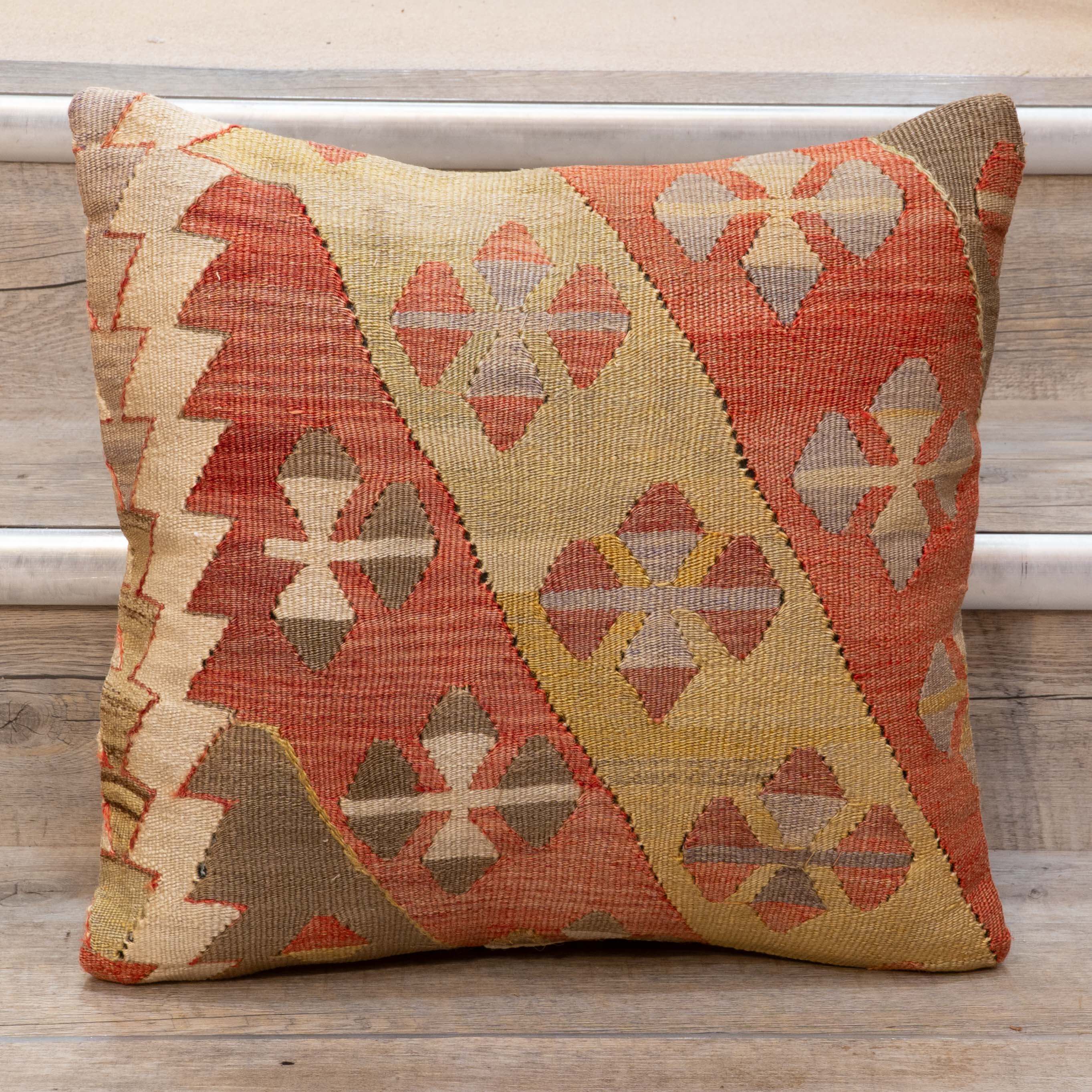 Our collection of kilim cushions offers great colours, designs, and textures. The pieces are often taken from larger old kilims, sometimes antique, and cleaned and sorted to repurpose and salvage a treasured fabric that would otherwise be lost. The pattern may be cut in unusual and interesting ways to ensure that as much of this precious resource as possible is saved. In addition, the cushions are fibre-filled, making them suitable for individuals with feather allergies.  Product size: 40 x 40cm (1'4 x 1'4)