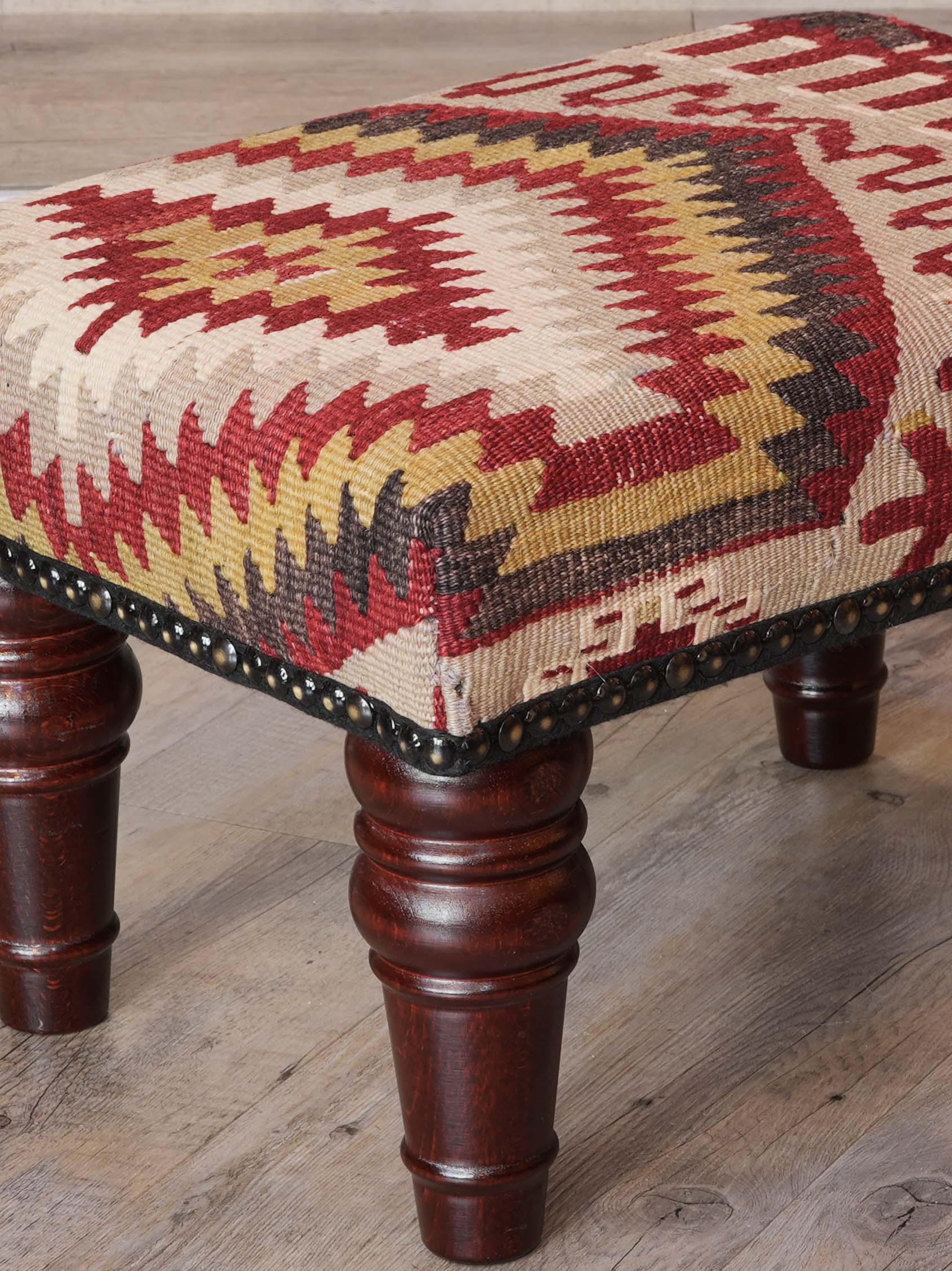 Our furnishing collection utilises pieces often salvaged from old Turkish kilim. As an expensive furnishing fabric, we ensure waste is kept to the absolute minimum. This desire to preserve every useable piece enables us to produce some smaller pieces, such as draught excluders or small cushions. With the footstools, the fabric is cut to keep as much of the kilim as possible; this often produces an interesting or unusual look, as the pattern may be offset rather than centred. This certainly makes pieces unique and different. We also have a limited number of very individual and unique chairs, with no two pieces ever the same.
