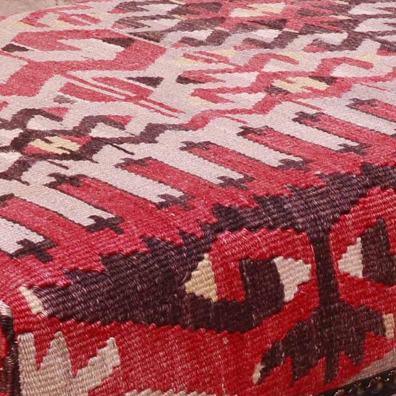 Our Kilim furnishing collection utilises pieces often salvaged from old Turkish kilims. A very expensive furnishing fabric; with this in mind, we ensure waste is kept to the absolute minimum. This desire to preserve every useable piece enables us to produce some smaller pieces, such as draught excluders or small cushions. With our footstool, how each part of the kilim is cut (depending on condition and wear) can make the stool look very interesting; the pattern or Motifs may be offset rather than centred, making pieces unique and different. We also have a limited number of very individual and unique chairs, with no two pieces ever being the same.