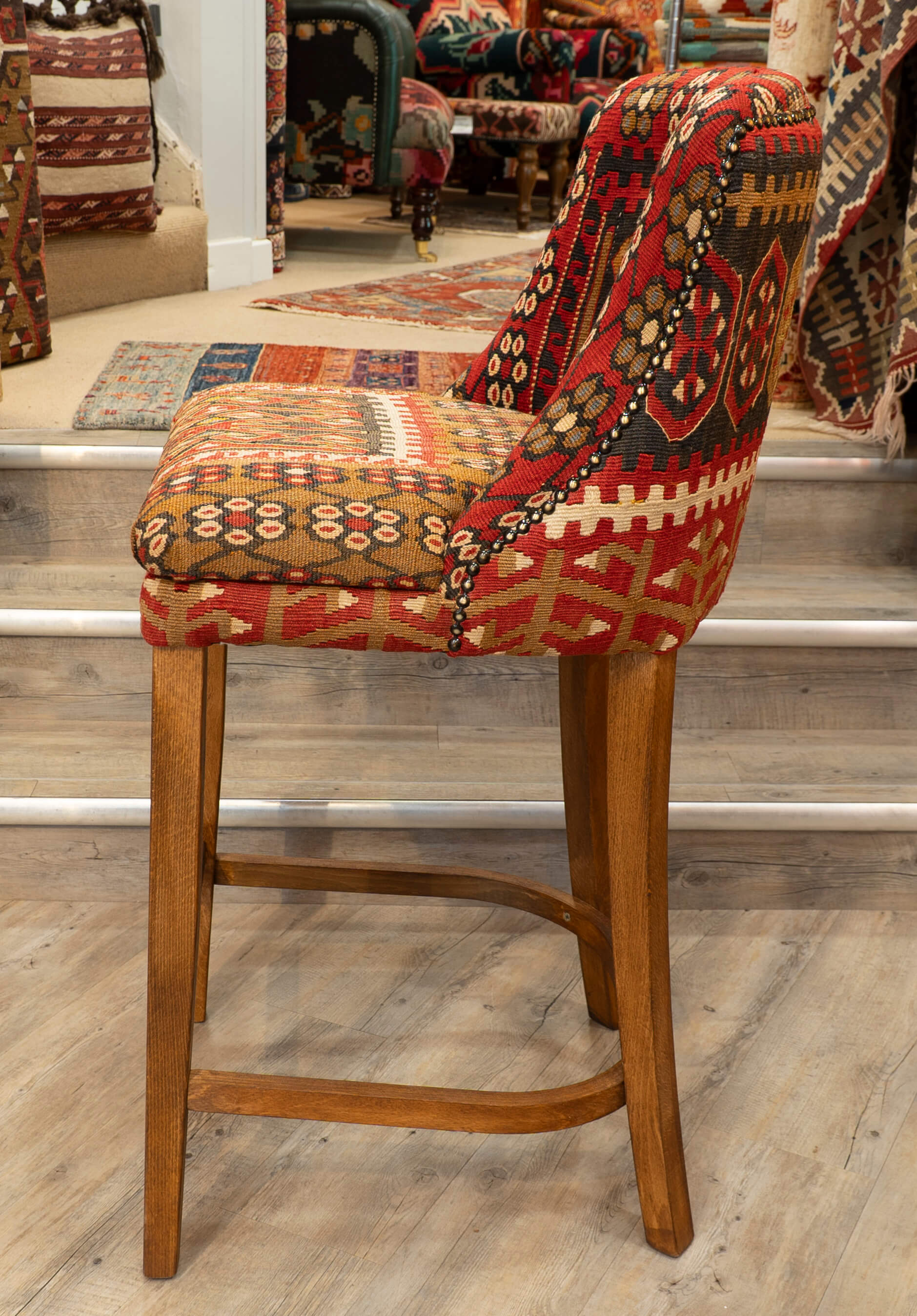 These interesting bar stools are very smart. The salvaged kilim has been repurposed to create interesting high stools, which will be a fabulous addition to anyone seeking something extra special and unique. Each piece of Kilim has been expertly placed to full effect; although we can't do multiple identical chairs, we try to get them made as 'Jack & Jill' pairs. Of course, if anyone requires more, we would cut kilims from the same piece to create a set that would be more like a 'harlequin set'. Don't hesitate to contact us to discuss this if needed. Finally, the chairs were studded around the back, and the wood was polished with Danish wax to a medium oak.