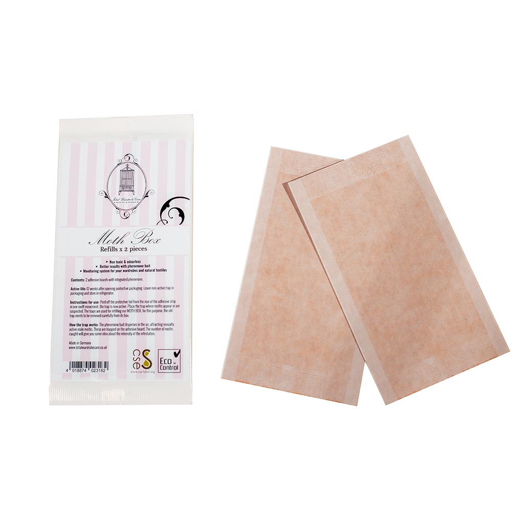 This 'Moth Box refill' contains two adhesive cards which emit an attractive female pheromone, which is completely irresistible to adult male moths. It is designed to attract male moths searching for females ready to mate. The moth sticks to the paper and is prevented from mating with female moths, breaking the eternal moth cycle. The pheromone is specific to the moths we want to capture.